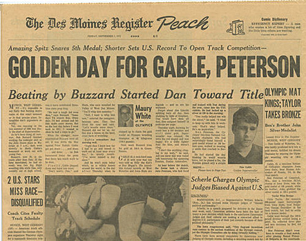 ![]() 1972 Des Moines Register announcing Olympic wins by Gable and Peterson, Taylor bronze |