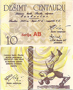 ![]() 1991 Lithuania 10 centaru banknote |